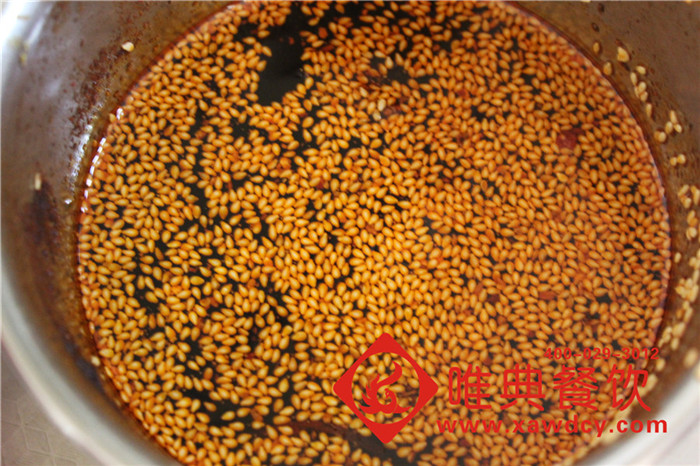 將五斤油燒到240度,涼到180度放入混合料55克、撈出混合料渣,170度放芝麻、160度加辣椒面6兩(中粗5兩、1兩細辣椒面),醋少許 蓋上第二天使用,這樣顏色、味道會更好!